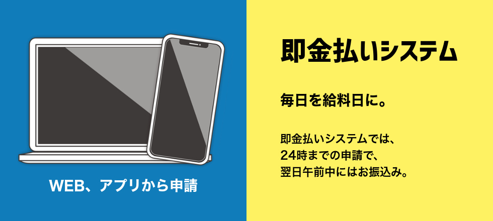 Featureサービスの特徴 ワークトゥデイで完了した業務を当日申請で翌日入金 24時間 365日 申請可能 審査不要 カード発行不要 最短翌日午前中 Conditions申請条件 申請締切時間 24時 申請範囲 業務完了分 振込日時 翌日午前中 申請対象 ワークトゥデイ会員 申請方法 WEB、配車アプリ 手数料 申請金額の8% ※申請は当日完了分迄となり金額指定はできません。